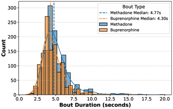 The distribution of bout durations for methadone and buprenorphine. The histogram represents the frequency of bout durations (in seconds), with overlaid kernel density estimates (KDEs) for both substances. Dashed vertical lines indicate the median bout duration for each group. Methadone is shown in blue, while buprenorphine is shown in orange.