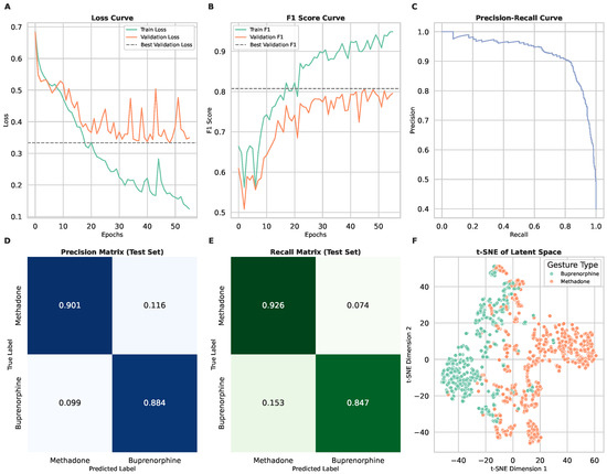 Model performance and gesture classification results for Scenario 1. In this scenario, the model performs binary classification to differentiate between two medication-taking gestures: methadone (liquid) and buprenorphine (sublingual film). (A) Training and validation loss curves, showing model convergence and generalization over epochs. (B) F1 score curves for training and validation sets, indicating classification performance across medication types. (C) Precision–recall curve demonstrating the model’s ability to distinguish between methadone and buprenorphine gestures. (D) Precision matrix of the test set, illustrating the proportion of correctly classified gestures for each medication type. (E) Recall matrix of the test set, highlighting model sensitivity to each medication-taking gesture. (F) t-SNE visualization of latent space representations, showing the clustering of methadone and vuprenorphine gestures.