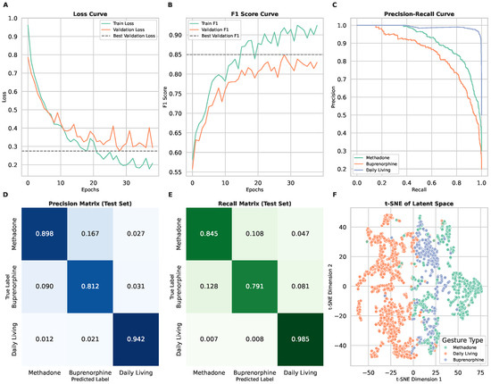 Model performance and gesture classification results for Scenario 2. In this scenario, the model classifies gestures into three categories: methadone, buprenorphine, and daily living. (A) Training and validation loss curves demonstrate model convergence over epochs. (B) F1 score curves for training and validation sets indicate classification performance across classes. (C) Precision–recall curves highlight the model’s ability to distinguish between the three gesture categories. (D) Precision matrix of the test set, showing the proportion of correct predictions for each class. (E) Recall matrix of the test set, illustrating the sensitivity of the model to each class. (F) t-SNE visualization of latent gesture representations, demonstrating the separation between the methadone, buprenorphine, and daily living gestures.