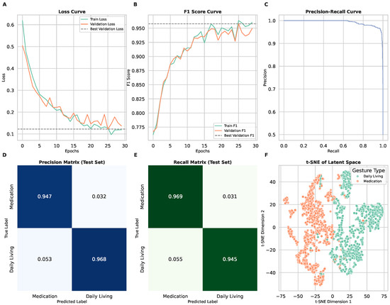 Model performance and gesture classification results for Scenario 3. In this scenario, the model performs binary classification to distinguish between medication-taking gestures and daily living activities. (A) Training and validation loss curves showing model convergence and generalization over epochs. (B) F1 score curves for training and validation sets, representing classification performance. (C) Precision–recall curve illustrating the trade-off between recall and precision for detecting medication-taking gestures. (D) Precision matrix of the test set, showing the proportion of correct predictions for each class. (E) Recall matrix of the test set, highlighting model sensitivity to medication-taking gestures. (F) t-SNE visualization of latent space representations, demonstrating separation between medication-taking and daily living gestures.