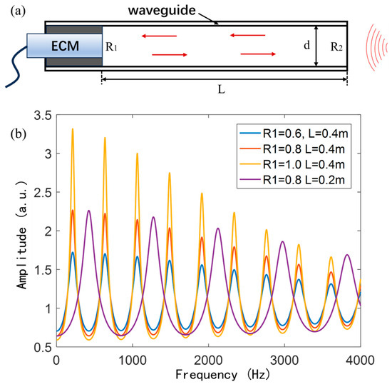 As shown in Figure 1a, the AFPRD model consists of a resonant cavity with a length L, where R1 represents the reflectivity of the electret condenser microphone (ECM) diaphragm, and R2 denotes the reflectivity of the open end. The sound wave enters the waveguide from the open end and undergoes multiple reflections. The sound wave amplitude at the diaphragm can be described by reflectivity, amplitude attenuation, phase change, and amplitude recursive relationship. The amplitude of the incident wave is , and the amplitude after propagation attenuation is , where α is the attenuation coefficient. After reflection, the phase changes by , so the reflected wave is as follows: