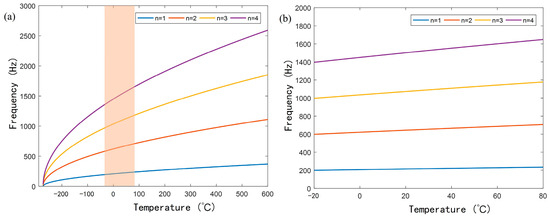 (a) The relationship between the first four resonant frequencies and temperature; (b) The linear change in resonant frequency with temperature in the range of −20 °C to 80 °C.