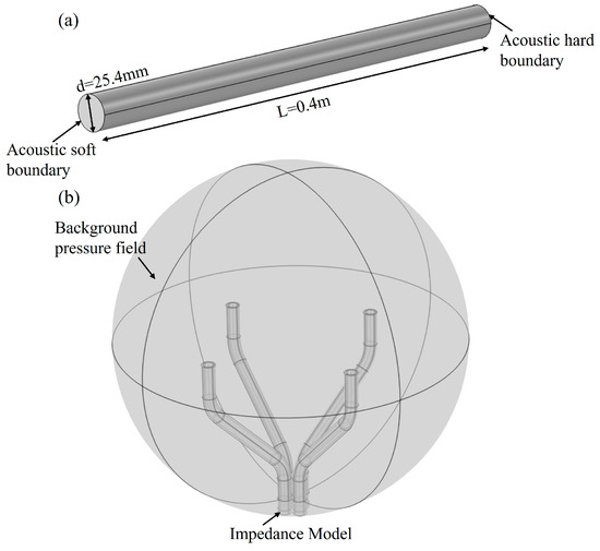 Finite element simulation of the characteristics of both AFPRD and its array was performed by Comsol, and the simulation models are shown in Figure 5. Figure 5a is a simulation of the interior of the acoustic waveguide in a cylindrical AFPRD. The acoustic waveguide is 0.4 m long and has an inner diameter of 25.4 mm. The open end is in direct contact with the air as a soft sound field boundary, and the side wall of the waveguide is a rigid hard sound field boundary. The sound outlet is a closed end that can simplify the hard sound field boundary or set the impedance according to the properties of the ECM diaphragm. Figure 5b is an AFPRD array based on a curved acoustic waveguide. The axial length is 0.24 m and the array aperture is 0.1 m. In order to simulate a real sound positioning scene, an air dielectric sphere is used to wrap the array to realize the background pressure field. The outer layer of the spherical shell is set as a perfect matching layer to absorb reflected waves. A plane wave is applied at a specific position to simulate the sound wave incidence. The wall of the acoustic waveguide is a hard sound field boundary, and the sound outlet is an impedance model to simulate the sensor diaphragm.