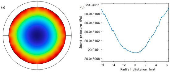 According to the sound pressure distribution results of the acoustic waveguide cross-section shown in Figure 6a, the sound pressure in the central area is slightly lower, while the sound pressure in the edge area is slightly higher. This is because the gas viscosity in the thermoviscous layer makes the gas flow velocity near the wall zero. In this case, the sound wave on the boundary will be locally reflected, and the superposition effect with the incident wave will cause the sound wave near the thermoviscous layer to be enhanced, thereby generating a larger sound pressure. The sound pressure sampling points are set along the diameter direction of the cross-section, and the results are shown in Figure 6b. Although the sound pressure distribution is uneven, the overall deviation is extremely small, and its relative error is less than one ten-thousandth, which is lower than the sensitivity threshold of general commercial microphones. Therefore, it can be considered that it will not have a significant impact on the measurement accuracy. In most cases, the effect of the thermoviscous layer is mainly concentrated in the area close to the wall. Therefore, in most areas of the acoustic waveguide, the propagation characteristics of the sound wave will not be significantly affected by the thermoviscous layer. In subsequent applications, the thickness of the thermoviscous layer needs to be fully considered. The acoustic waveguide with a certain redundancy in diameter can be designed so that the thermoviscous layer will not affect the diaphragm at the axis position.