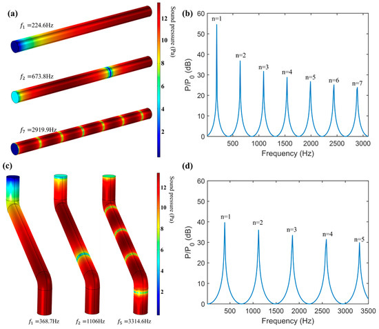 Figure 7a,c shows the first two low-frequency resonant modes and high-frequency resonant modes of the internal sound field of the AFPRD with a straight waveguide and a bent waveguide. It can be seen that the resonant mode pattern of the AFPRD with the bent waveguide is consistent with that of the uniform cylinder, and the sound pressure at the sound outlet is the maximum value compared to the sound inlet, indicating that the AFPRD has achieved amplification at the resonant frequency. Through frequency response analysis, the frequency response curve of the AFPRD is shown in Figure 7b,d. There is a linear relationship between the multi-order resonance frequencies. Although the cavity lengths are different, they all match Formula (5). This shows that the cavity length plays a major role in the structural parameters of the AFPRD, and the inner diameter and bent structure of the acoustic waveguide do not affect the resonance frequency distribution. Compared with the straight waveguide, the bent waveguide only has a reduced amplification corresponding to the resonant frequency but still maintains an enhancement of more than 30 dB. The existence of a linear relationship makes the prediction of these high-order modes easier and more accurate. The consistency of the finite element simulation results with the numerical calculation results of Figure 1b also fully verifies the accuracy of the theoretical model. Especially for the open end of the cylindrical acoustic waveguide, the transmission of sound waves is allowed, and there is a certain relationship between the fluid velocity and pressure at the opening. Due to the fluidity of the gas, the open end can be approximated as a soft acoustic field boundary. This model well describes the transmission characteristics of sound waves at the open end.