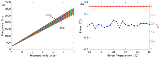 As shown in Figure 2a, each resonant frequency of the AFPRD has a corresponding functional relationship with temperature. Therefore, in theory, any resonant frequency can be used as a reference for temperature measurement. Since , the resonant frequency and temperature T show a nonlinear relationship. However, in actual temperature measurement applications, this nonlinear relationship has little effect on accuracy. On the one hand, as shown in Figure 2b, in the practical temperature range of −20 °C to 80 °C, the resonant frequencies of each order and the temperature can be approximated to be linearly related, and the coefficient of determination R2 of the fitting line exceeds 0.999. On the other hand, because the temperature measurement process is to measure the resonant frequency and infer the temperature in combination with the known system parameters, as long as these parameters can be accurately obtained and kept stable, the temperature can be solved through the known mathematical model.