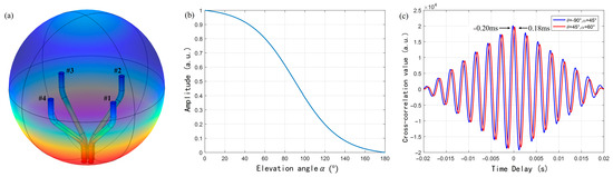 (a) Simulation model of the AFPRD array in an acoustic pressure field; (b) Normalized output sound pressure of AFPRD under different elevation angles; (c) Cross-correlation function of the time domain signals between sensor 1 and sensor 3 under two sound wave incident directions.
