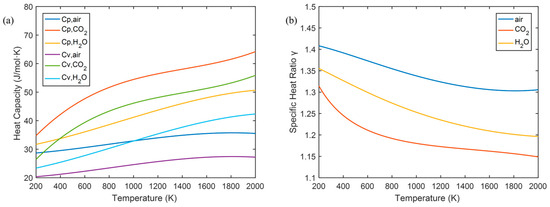 Figure 10 shows the temperature variation curve of the specific heat ratio of different gases. It can be found that for air at room temperature, and gradually decreases to about 1.35 as the temperature rises. The vibrational freedom of CO2 and H2O is easier to activate, and γ decreases more significantly. Therefore, for gases with a temperature greater than 200 K, a preliminary correction can be made using the formula:
