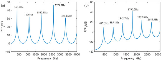 It is seen from Equation (4) that when , the sound pressure amplitude reaches the maximum value, indicating that this frequency is the resonant frequency .
