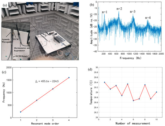 (a) Temperature measurement equipment in the anechoic room; (b) Frequency response curve under 17 dB background sound field; (c) Fitted line of the first four-order resonance frequencies; (d) Temperature results for 10 measurements.