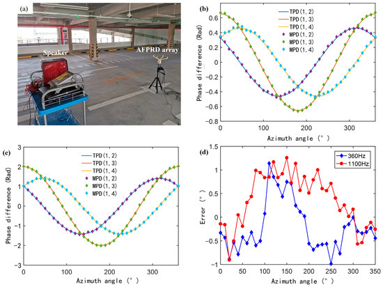 (a) Sound source localization test scene using the AFPRD array; (b) and (c) Measured phase differences (MPD) at two frequencies of 360 Hz and 1100 Hz between the two array elements of the AFPRD array and the corresponding simulated phase differences (TPD) (d) Azimuth angle measurement error.
