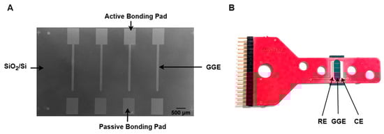 Electrochemical impedance spectroscopy (EIS) measurements were performed using a PARSTAT 273 potentiostat (Princeton Applied Research, Oak Ridge, TN, USA) with GG chips mounted on carrier boards in a three-electrode configuration. The impedance response was recorded at the formal redox potential of 1 mM [Ru(NH3)6]3+/2+ in 0.1 M KNO3, as determined from CV measurements. A frequency range of 0.1 Hz to 10 kHz was applied with a 10 mV AC perturbation. The resulting impedance spectra were analyzed and fitted using ZsimpWin software (version 2.00).