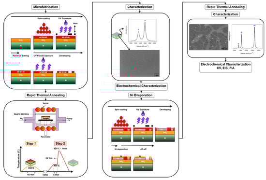 Figure 2 provides a detailed overview of the experimental workflow, outlining the key fabrication steps and characterization techniques. The process begins with the microfabrication of AZ 5214E photoresist patterns using photolithography, which defines the electrode geometry. This is followed by the fabrication of PPFs through RTA under an N2 atmosphere. Subsequently, a thin layer of nickel is thermally evaporated onto the PPF electrodes, serving as a catalyst for the transformation into GG via a second RTA process. The resulting electrodes are then subjected to structural, surface, and electrochemical characterization to evaluate their morphology, composition, and electrochemical performance.
