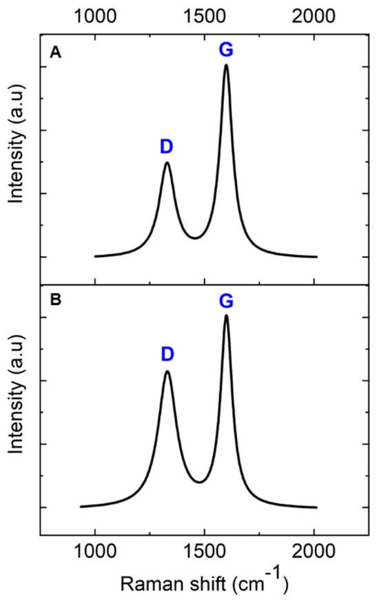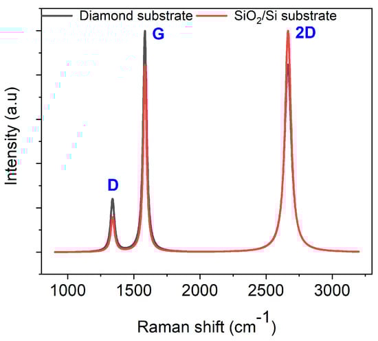 Raman spectroscopy was employed to investigate the transformation of AZ 5214E films into GC and their subsequent conversion into GG using a thin nickel film as a catalyst. This analysis was conducted on both SiO2/Si and polished PCD substrates using the RTA method, providing insights into the structural evolution and substrate-dependent effects on graphene formation. To ensure an accurate peak assignment and a clearer interpretation of the structural features, the Raman spectra for both substrates were baseline-corrected and normalized to their maximum peak intensity, with peaks fitted using a Lorentzian function. Figure 3A presents the Raman spectrum of the PPF at 950 °C for 1 min on a SiO2/Si substrate. The spectra reveal two prominent peaks at approximately 1343 cm−1 and 1593 cm−1, which are characteristic of GC, confirming the successful conversion of the AZ 5214E film into a disordered carbon structure [43,44]. The peak at 1593 cm−1, known as the G band, is attributed to the in-plane vibrational modes of sp2-bonded carbon atoms, a feature also observed in graphite. This band is indicative of graphitic domains and serves as a marker of sp2 carbon ordering within the material [1,45]. In contrast, the peak at 1343 cm−1, referred to as the D band, corresponds to the breathing modes of sp2 carbon atoms in aromatic rings and is indicative of structural defects or disorder within the carbon lattice [46].