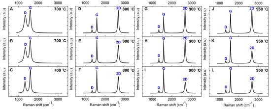 Baseline-corrected and normalized Raman spectra of nickel-coated glassy carbon films annealed via RTA for 1 min on SiO2/Si substrate. The spectra were measured at three distinct locations on a single sample for each temperature: (A–C) 700 °C, (D–F) 800 °C, (G–I) 900 °C, and (J–L) 950 °C.
