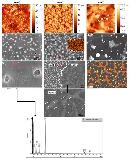 At 950 °C, AFM analysis (Figure 8I) reveals an increase in RMS roughness to 9.6 nm, reflecting the continued evolution of the graphene film and the agglomeration of the Ni layer. This roughness can be attributed to the formation of multilayer graphene, as indicated by Raman analysis, and the presence of larger residual Ni particles (≈42 nm) [64], resulting from ongoing agglomeration, as confirmed by EDX analyses (Figure 8K). Compared to 900 °C (Figure 8H), SEM images at 950 °C (Figure 8J) show larger, less bright Ni/C islands interspersed with darker regions, indicative of a thicker and more heterogeneous graphene layer. Raman spectra further support this observation, showing a reduction in the I2D/IG ratio (Table 2), which signifies a transition from bilayer graphene at lower temperatures to multilayer graphene. This transition is consistent with the fact that higher annealing temperatures enhance carbon diffusion in Ni, facilitating the formation of thicker graphene layers upon cooling [68,69]. However, the increased temperature also accelerates structural changes in the Ni layer, particularly dewetting, which disrupts the catalytic uniformity required for consistent bilayer graphene formation. SEM images (Figure 8J) reveal larger bright Ni particles compared to those observed at 900 °C, embedded within the graphene layer. EDX mapping confirms these particles as residual Ni (Figure 8K).