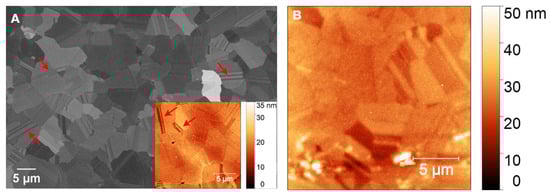 (A) SEM image of polished PCD and (B) AFM images of nickel-coated glassy carbon on PCD. Arrows indicate twin boundaries. The inset in (A) presents an AFM image of polished PCD, highlighting its smooth morphology and fine surface features.
