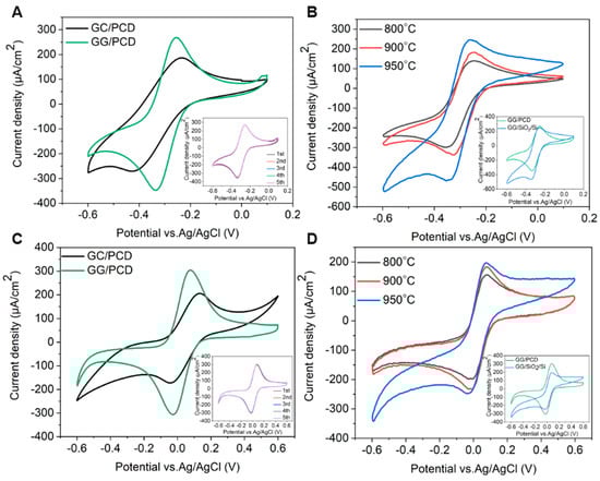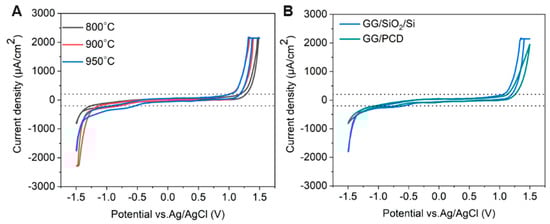 The samples were then allowed to cool down to room temperature over 10 min. In the second step, designed to complete the graphitization process, the temperature was increased to 450 °C at a rate of 7.5 °C/s and held for 5 min before being further ramped up to 950 °C at 20 °C/s, where it was maintained for 1 min. The samples were then allowed to cool down to room temperature under a continuous nitrogen flow of 5000 sccm. Following pyrolysis, the SiO2/Si substrates were cut into 5 × 10 mm2 pieces, and both the PPF/SiO2/Si and PPF/PCD samples were analyzed using surface and electrochemical characterization techniques. The vertical reduction in film thickness due to pyrolysis was measured using a Dektak profilometer (Bruker, Billerica, MA, USA.).