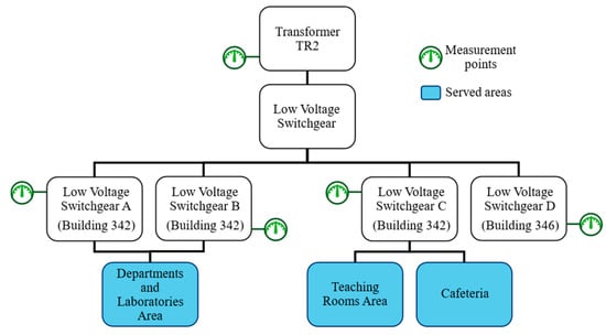 The deployed DMS facilitates the acquisition of diverse electrical parameters at various locations throughout the building. The block diagram presented in Figure 1 describes the structure of measurement nodes and sub-nodes. Specifically, transformer TR2 serves as the power source for two structures (Buildings 342 and 346) within the complex. Low Voltage (LV) switchboards A and B distribute power to the departments (including offices and meeting rooms) and laboratories. Switchboard C provides electricity to the lecture rooms and the building’s cafeteria, which have appliances such as ovens and refrigerators. The green symbol indicates the measurement points, while the served areas are depicted in blue.