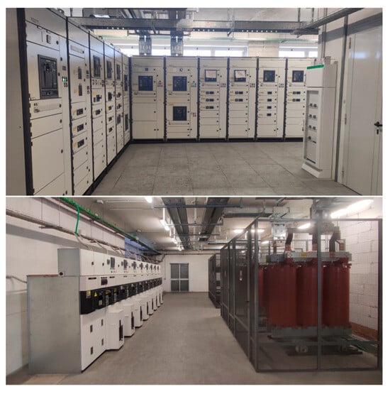 At each point, voltage, current, active and reactive power, current and voltage Total Harmonic Distortion (THD) coefficient, and power factor measurements are acquired in every phase. The frequency of the system is also measured. The measurement instrumentation includes an EM2389 energy meter and DM3TA series Current Transformers (CTs). The meter has an accuracy of 1% on active power measurements. The installed CTs belong to class 0.5. The LV and the Medium Voltage (MV) substations are pictured in Figure 2. Considering the installed equipment, any algorithm or method to be developed must consider the constraints in terms of resolution. The acquired data are collected every 15 min throughout the day. Data have been stored since the 6 June 2023.