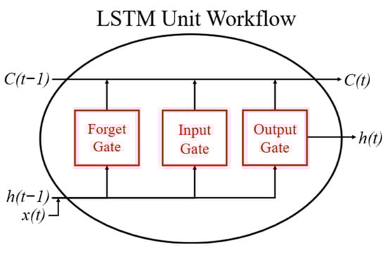 Figure 3 depicts a general scheme of an LSTM cell, the core of an LSTM network. C(t − 1) and C(t) represent the previous and current cell states, while h(t − 1) and h(t) are the previous and current hidden states, and x(t) is the current input []. The gates (forget, input, and output) use Sigmoid and Hyperbolic Tangent (Tanh) activation functions to manage information flow. The Sigmoid function limits outputs between 0 and 1, indicating how much information to retain or discard, while Tanh constrains values between −1 and 1, preventing values from becoming excessively large or small []. The model has been implemented using the PyTorch library (version 2.4.0) in Python programming language (version 3.12.4).