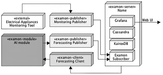 To support these requirements, the ExamonX [] framework was selected. Designed for IoT monitoring and predictive maintenance, ExamonX integrates components for data flow and processing, with Cassandra for database management, KairosDB for time-series support, and Grafana for visualization. ExamonX includes a software development kit for creating publisher applications, which adapt and send external data to the system. Figure 4 illustrates the ExamonX architecture, with an AI forecasting module (housing the LSTM model) and two publishers. The “monitoring publisher” inputs data from the DMS, while the “forecasting publisher” inputs data generated by the AI module. This design separates data sources from processing algorithms, ensuring scalability and modularity, and allowing easy expansion for future features. All the data and analytics are accessible through Grafana’s web interface.