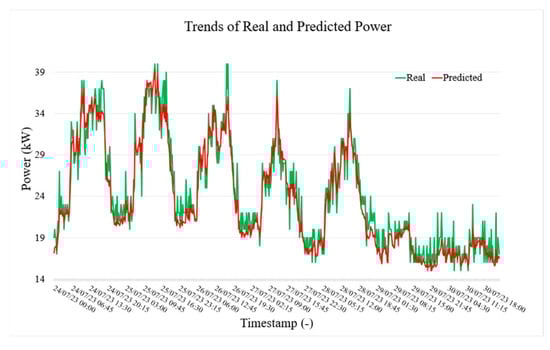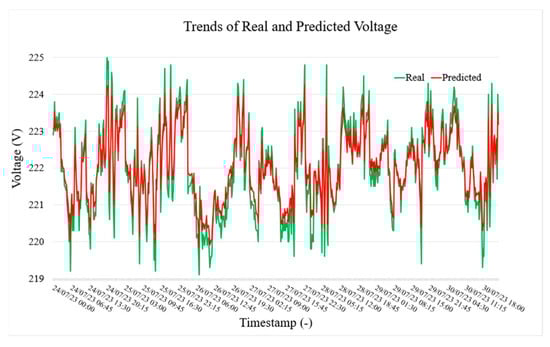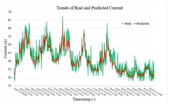 Figure 5, Figure 6 and Figure 7, respectively, show the actual (green) and predicted (red) power, current, and voltage values in LVS-A over a week from 24 July to 30 July. The model forecasts current values 15 min ahead using data from the previous 2 h. In general, the predicted trend closely follows the actual values, capturing general patterns and trends. However, some differences are evident during rapid fluctuations, where the predicted line smooths out sharp peaks (but still within the accuracy limits given by the specification). Despite this, the visualization demonstrates satisfactory predictive accuracy, though some refinement may be needed for extreme variations (outside the scope of the paper).