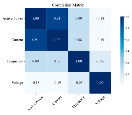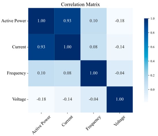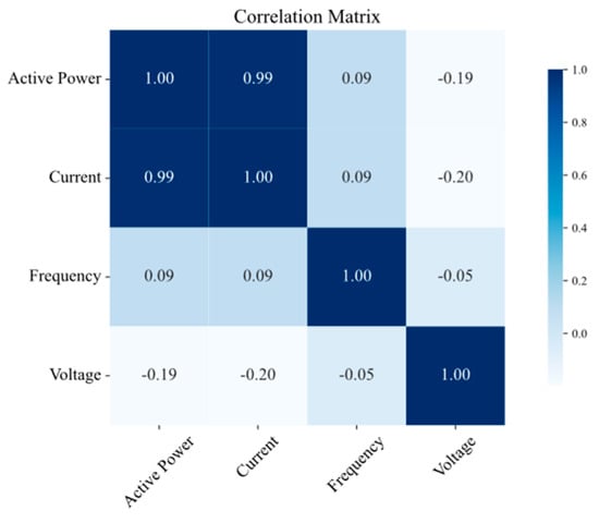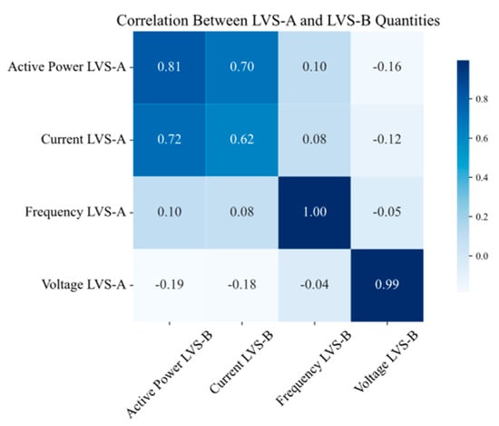 The Pearson correlation coefficients were calculated pairwise for power, current, voltage, and frequency at all the considered measurement points (TR2, LVS-A, LVS-B, and LVS-D).