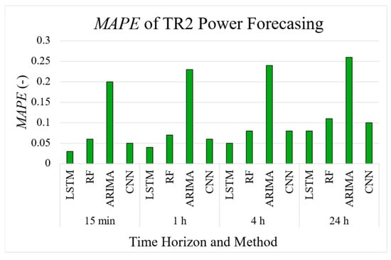 To compare the LSTM model with the results from the other methods, Figure 13 displays the MAPE values obtained for power forecasting at the TR2 measurement point using an input sequence of eight data points (2 h) and various time horizons. The results demonstrate that the LSTM model consistently achieves lower MAPE values across all the time horizons.