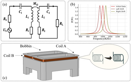As illustrated in Figure 1a, the basic circuit structure of the wireless power and information transfer system consists of a primary resonant circuit (comprising a capacitor , an inductor , and a resistance ) and a secondary resonant circuit (comprising a capacitor and an inductor ). The primary coil is constructed using multiple turns of copper wire and, together with capacitor , forms an LC resonant circuit. When the drive circuit applies a high-frequency alternating current (AC) signal, generates an alternating magnetic field, inducing energy transfer to the secondary coil through magnetic resonance coupling. The secondary coil receives the transmitted energy via magnetic induction and forms resonance with its matching capacitor , ensuring maximum power transfer to the receiving device. This efficient energy and data transmission mechanism allows the receiving device to be set without physical contact, providing high-speed operation, enhanced durability, and strong resistance to environmental interference.
