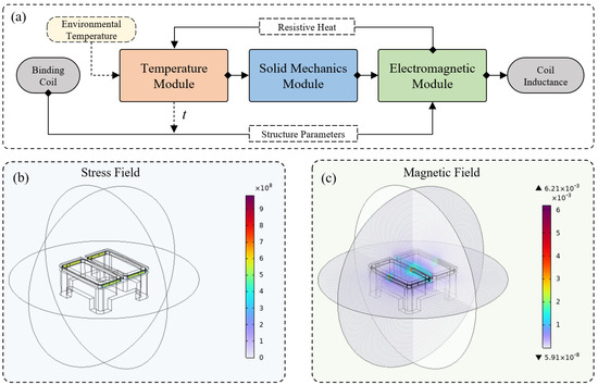 (a) Multi-physics coupling process. (b) Stress field under −20 °C. (c) Magnetic field under −20 °C.