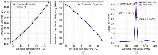 To investigate the effect of temperature variations on the resonant frequency , the simulated values of inductance and capacitance over the temperature range of −40 °C to 50 °C were substituted into the resonant frequency formula. The calculated values of at different temperatures are presented in Table 1.