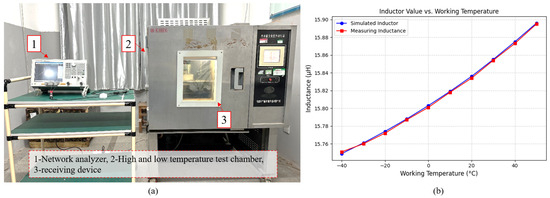 The experiment covered a temperature range of −40 °C to 50 °C, with measurements taken at 10 °C intervals. The measured inductance values were then compared with the simulated values, as presented in Table 2.