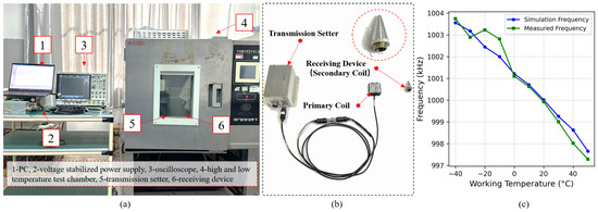 The resonant frequency of the system is determined by the actual values of the inductance and the capacitance . For the resonant system studied in this research, the design resonant frequency at an ideal temperature of 20 °C is 1 MHz. However, under varying temperature conditions, is significantly affected by temperature fluctuations, while , which is an NP0 surface-mount capacitor (temperature coefficient 0 ± 30 ppm/°C), remains relatively stable. Consequently, inductance variation is the primary factor influencing resonant frequency drift. In practical operation, the operating frequency of the wireless power and information transfer system must remain synchronized with the resonant frequency to ensure optimal resonance conditions for efficient energy and data transmission.