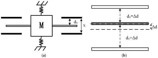 Schematic diagram of accelerometer principle: (a) MEMS accelerometer model. (b) Movable pole plate displacement.
