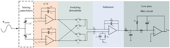 A differential charge amplifier is used to implement C-V conversion in this paper. This circuit structure allows the measurement of small capacitance variations, even in the presence of large parasitic capacitance to ground. Additionally, the differential structure ensures that the non-inverting input voltage remains stable, and signal modulation can be achieved with a single carrier. The capacitive readout circuit is shown in Figure 2. The high-frequency carrier signal modulates the capacitance signal to a high frequency through the accelerometer. The C-V conversion circuit then converts the differential capacitance changes into voltage. After demodulation by the switch, the signal of interest is downconverted to low frequency, while the noise remains at high frequency. After subtraction, common-mode noise in the signal is further eliminated. Finally, after passing through a low-pass filter, the high-frequency noise is removed, yielding the high-precision acceleration signal to measure.