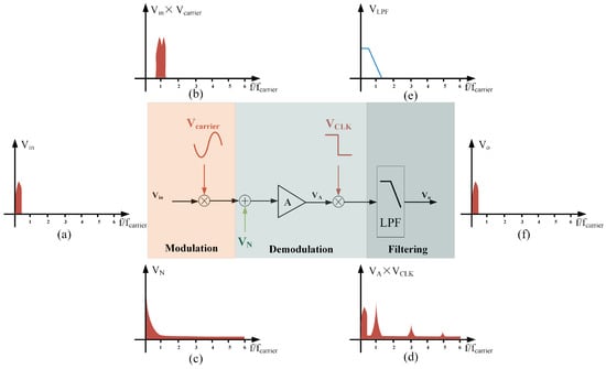 To more intuitively illustrate the circuit’s suppression effect on low-frequency noise, the circuit structure is simplified, as shown in Figure 3. In the modulation stage, the signal of interest is modulated to the carrier frequency, as shown in (b), while the noise in the circuit remains in the low-frequency band, as shown in (c). After the C-V conversion module, the signal is demodulated, transferring the signal of interest to a low frequency, while the low-frequency noise is modulated to a high frequency, as shown in (d). After passing through the low-pass filter, as shown in (e), the final output is the high-precision signal of interest, as depicted in (f).