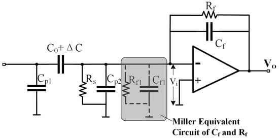 The charge amplifier can perform the first stage of capacitance detection. First, the equivalent circuit of a typical charge amplifier is analyzed, as shown in Figure 4. In the figure, represents the equivalent static capacitance, is the capacitance variation, is the input resistance of the operational amplifier, is the carrier signal, and are the parasitic capacitance values at the interface, is the feedback resistor, is the feedback capacitor, and and are the Miller equivalent values of the feedback resistor and feedback capacitor, respectively.