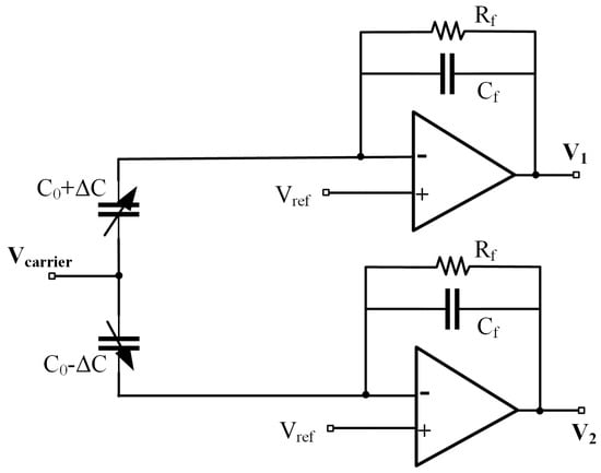 This design uses a differential charge amplifier to implement the first stage of capacitance detection, thereby improving detection accuracy and achieving dual outputs. After passing through a subtraction circuit, common-mode noise interference is effectively suppressed. The circuit structure is shown in Figure 5. The input high-frequency carrier signal is , and the sine wave signal is labeled . represents the reference voltage at the inverting input of the operational amplifier, ensuring that the charge amplifier operates in a deep negative feedback state to maintain the circuit’s stability and linear response.