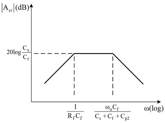 Under high-frequency conditions, the input noise voltage source of the op-amp gradually becomes the main source of noise, and has a crucial effect on the circuit noise. Therefore, the selection of low-voltage noise op-amps can effectively reduce the noise at the input. In PCB design, by avoiding long parallel traces and ensuring proper grounding, the generation of large at the op-amp input can be suppressed. As discussed in [], mainly introduces a pole into the charge amplifier, which limits the operating frequency of the C-V circuit. The circuit’s Bode plot is shown in Figure 10.
