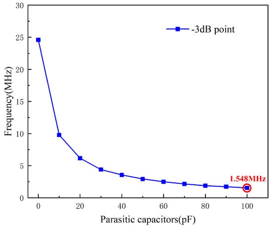 In the figure, represents the op-amp’s unity-gain bandwidth product. It is evident in Figure 10 that limits the operating frequency range of the circuit. A parameter sweep was performed with values ranging from 0 to 100 pF, and the attenuation trend of the corresponding −3 dB point is shown in the Figure 11.