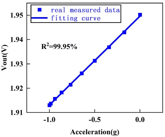 In Equation (16), and correspond to the output voltages when the accelerometer is flipped to and , respectively. To prevent the circuit from exhibiting different gains for ±1 g acceleration, the output voltages for ±1 g are averaged. Additionally, the output voltages are recorded for every 10° change as the accelerometer is moved from −1 g to 0 g, and a linear fit is performed. The system’s linearity is found to be 99.95%, demonstrating that the system has good linearity (Figure 14).