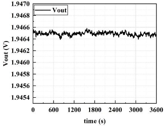 The data acquisition is set to collect the system’s output voltage value every 1 s. Figure 15 shows the test data of the accelerometer in the 0 g state. Taking the test data from 1 h after stabilization, the standard deviation of the output is 13.4 uV, and the stability of the system’s zero bias over 1 h is 0.38 mg.