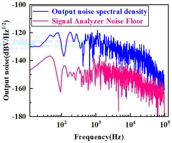 To test the noise performance of the circuit, an APX555 spectrum analyzer (Audio Precision, Beaverton, OR, USA) was used to measure the noise power spectral density (PSD) of the final output signal in the circuit. The test results are shown in Figure 16, in which the blue line is the PSD of the readout circuit output, and the red line is the PSD of the signal analyzer’s noise floor. As can be seen in Figure 16, the noise floor of the output of the readout circuit is (), and the noise floor of the signal analyzer is (). The circuit output noise is calculated to be , and the capacitive resolution is , using Equations (17) and (18), respectively. Equation (19) represents the conversion relationship among , , and , where represents the circuit’s sensitivity to capacitance.