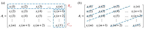 where Ri,1Rn×1 and Ci,nR(m−1)×1. Another way to obtain the singular component xi is by diagonal averaging, where each element of xi can be obtained by averaging along the anti-diagonals, as shown in Figure 1b. Interestingly, regardless of any of the methods mentioned above being used, the raw signal can be perfectly reconstructed by adding all decomposed SCs, as shown in Equation (5).