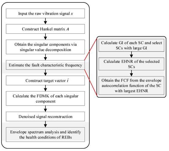 To overcome the drawbacks of the abovementioned SVD-based signal denoising method, this paper proposes a new selection scheme based on frequency domain multipoint kurtosis (FDMK) to select the effective SCs. FDMK evaluates SCs based on their periodicity and impulsiveness, ensuring the accurate selection of SCs that contain fault-related information, unlike traditional SVD-based methods that retain only large-energy SCs. Additionally, a reweighting strategy based on FDMK is introduced to enhance weak fault features during the reconstruction of the denoized signal. In addition, to solve the problem of the fault characteristic frequency or fault period not being given in advance, the process of estimating the fault period was incorporated, which allowed the proposed FDMK-SVD to operate effectively without prior knowledge of the fault period or characteristic frequency. Therefore, the proposed FDMK-SVD can adaptively achieve fault diagnosis and health assessment of REBs without prior information.
