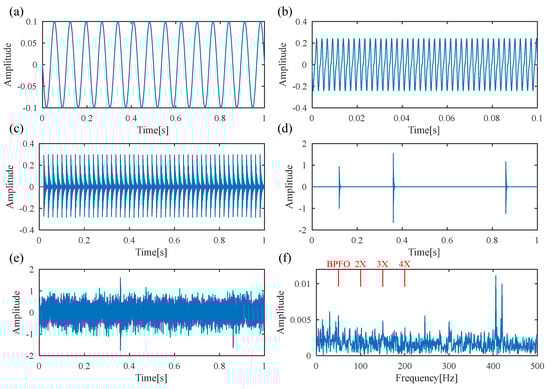 Simulated signal. (a) rotor vibration; (b) gear meshing; (c) defect impulses; (d) random shocks; (e) noise-added mixture signal; (f) envelope spectrum.