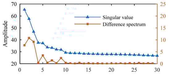In the abovementioned SVD-based signal processing approach, it is important to determine the proper threshold k to guarantee denoising performance. The selection of k has been investigated in several studies, such as the difference spectrum [], correlation coefficients [], and the median value of singular values []. Among these methods, the difference spectrum is frequently adopted because of its easy implementation and good performance in applications. More details about the difference spectrum can be found in [].