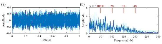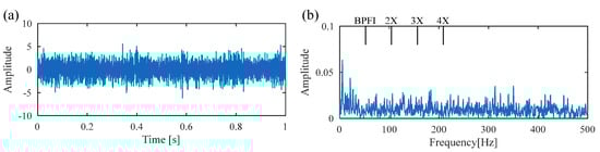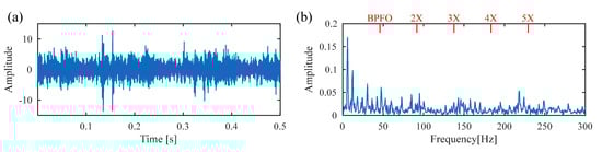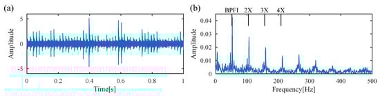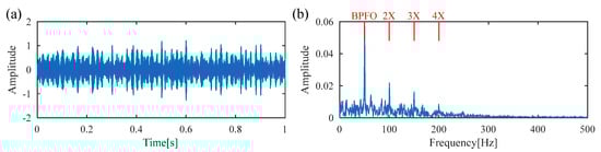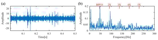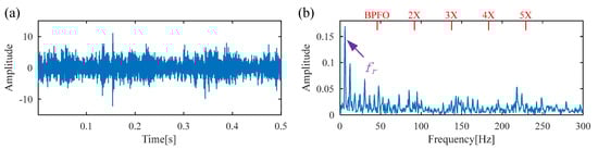 Since the vibration signal contains abundant fault information that can effectively reflect the health conditions of REBs, vibration analysis-based diagnostic methods have been widely applied for fault diagnosis []. When a fault occurs in a bearing, a series of repetitive impulses with a unique period are produced in the vibration signal and excite the resonances of the bearing and mechanical system [,]. Therefore, fault diagnosis of REBs can be achieved by detecting the periodical fault impulses in the time domain waveform or fault characteristic frequency (FCF) in the envelope spectrum domain. However, fault-induced repetitive transients are often submerged by strong background noise and other interferences, making fault diagnosis in real-world applications challenging. Therefore, extracting the repetitive impulses from the raw vibration signal is a critical and difficult task in the fault detection of REBs.