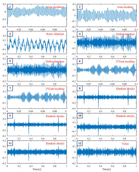 The first part is the vibration from the rotor or shaft, where f0 is the rotation frequency, An and an represent the amplitude and phase of the nth harmonic, respectively. The vibration signal originating from gear meshing is represented by the second part, where the number of gear teeth is denoted as T, and the amplitude and phase of the nth meshing frequency are represented by Bn and βn. The third part represents the defect impulses caused by the failure of the rolling bearing, where the amplitude of the ith impulse is represented by Di, and Td represents the interval time between the two adjacent impulses. Moreover, τi is used to simulate the random slip of the bearing, which is usually set to 1~2% of the fault period.